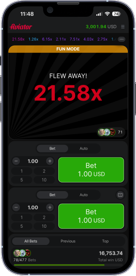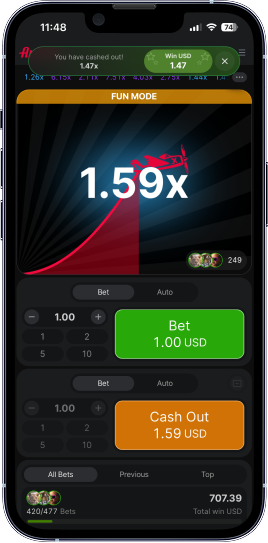 • The aircraft goes up on the screen, with the odds increasing. Players place bets before the round starts and cash out when the odds reach the desired level;